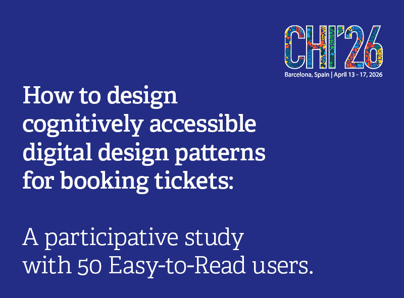 In unserer neuesten Studie untersuchen wir, wie Leichte Sprache in digitalen Medien umgesetzt werden sollte, um Menschen mit kognitiven Beeinträchtigungen die Auswahl eines Events und eines Datums zu ermöglichen. Zusätzlich haben wir den Bestellprozess beleuchtet. In einem innovativen, partizipativen Designprozess haben wir mit vier Co-Forschenden mit kognitiven Beeinträchtigungen und einer professionellen UX-Designerin die Webseite der Kammerspiele München in drei Varianten überarbeitet. An der Testphase nahmen 50 Personen mit kognitiven Beeinträchtigungen und 12 Studierende als Kontrollgruppe teil. Die Studie wird auf der CHI2026 in Barcelona vorgestellt. Der Artikel wird nach der Konferenz hier abrufbar sein.